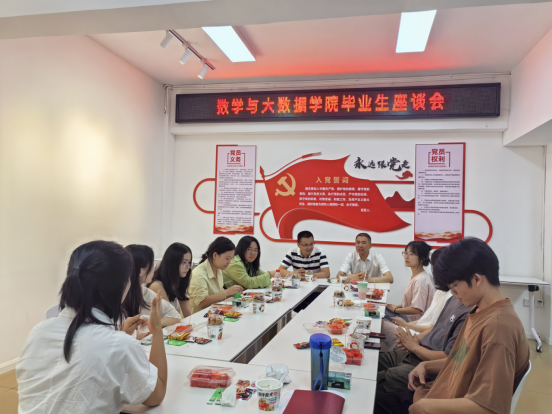2025 年 6 月 17 日晚,数学与大数据学院于学生宿舍 3 栋“一站式”学生社区活动中心举行毕业生代表离校座谈会。学院领导班子成员、学办主任、辅导员老师以及各毕业班学生代表共同参与了此次活动,大家齐聚一堂,畅谈求学感悟,为学院未来发展建言献策。座谈会现场气氛温馨而热烈。