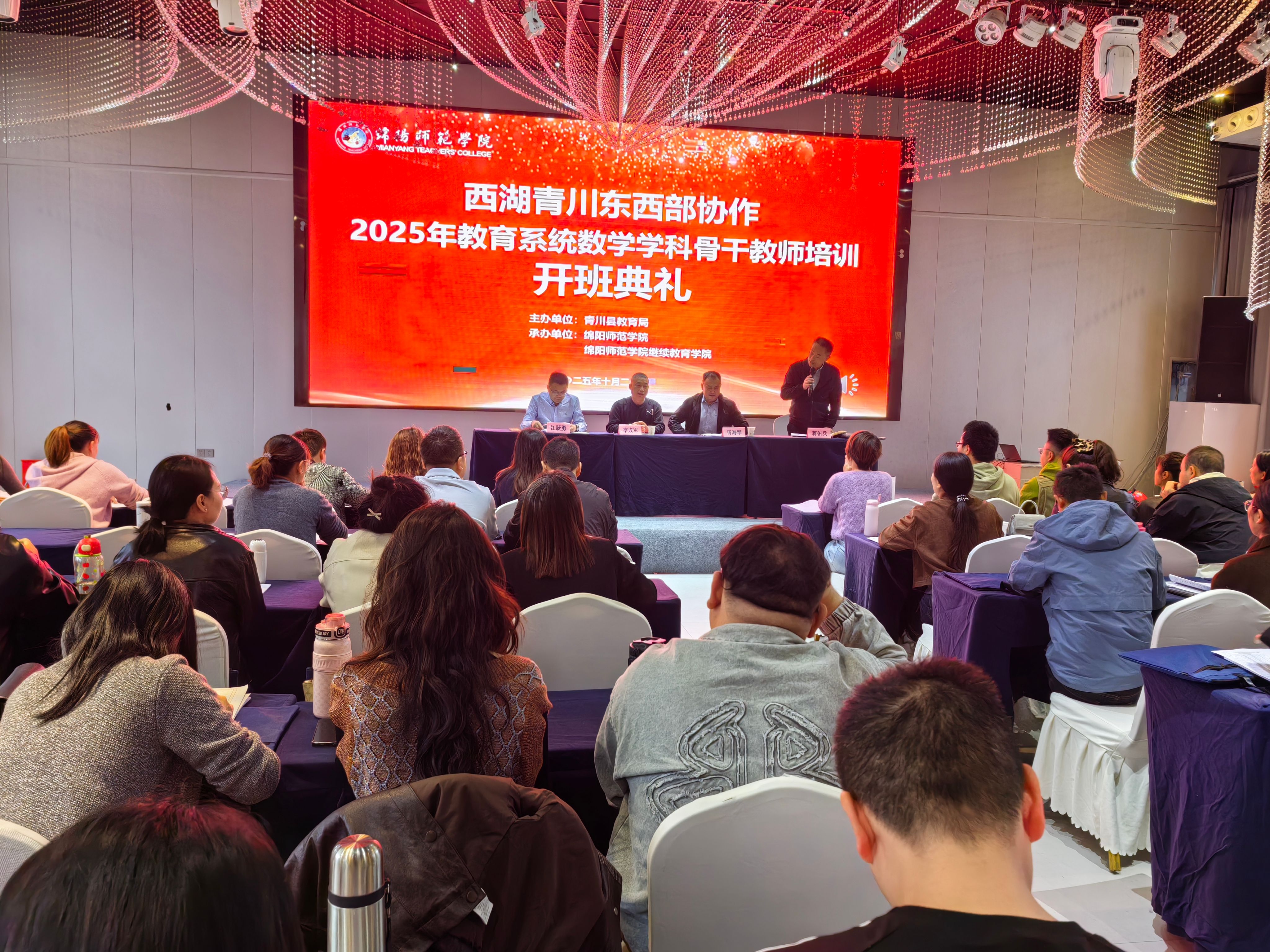 2025年10月20日,由青川县教育局主办、绵阳师范学院承办的西湖青川东西部协作2025年教育系统数学学科骨干教师培训开班典礼在绵阳举行。青川县教研中心教研员李成军,绵阳师范学院继续教育学院院长胥海军,本次培训首席专家绵阳师范学院数学与大数据学院副院长江跃勇,项目组成员和全体培训学员参加典礼。