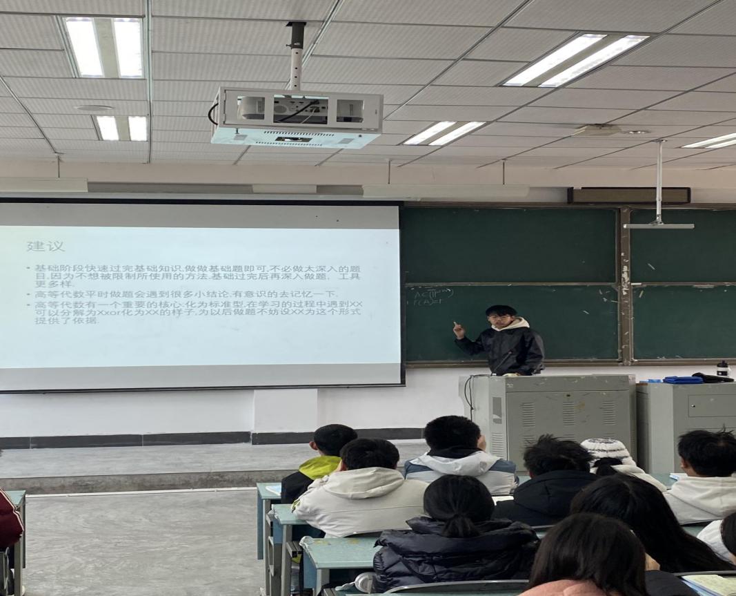 活动伊始,赵甫荣邀请数学与应用数学专业2024级王位彬同学分享自己的数学学习经验。王位彬结合自身情况,从学习心得、困难应对以及参考书目推荐等方面进行了分享。随后,赵甫荣结合王位彬的分享,围绕高等代数相关知识点,就如何深入理解数学、认识数学的本质以及如何更好地学习数学进行了思想认识和方法技巧上的指导。赵甫荣鼓励同学们不要畏惧数学学习的困难,要主动把握数学学习的机会,不断地积累和掌握适合自己的学习方法,努力提升数学素养,为今后的发展奠定良好的基础。